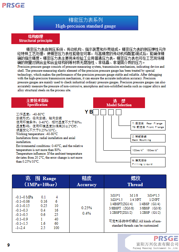 • 产品描述: 精密压力表由测压系统、传动机构、指示装置和外壳组成。精密压力表的测压弹性元件经特殊工艺处理,使精密压力表性能稳定可靠,与高精度的传动机构配套调试后,能确保精确的指示精度。精密压力表主要用来校验工业用普通压力表,精密压力表也可在工艺现场精确的测量对铜合金和合金结构钢等材质无腐蚀性、非结晶、非凝固介质的压力。