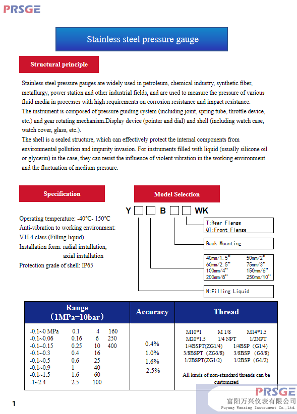 • Product description: Stainless steel pressure gauges are widely used in petroleum, chemical industry, synthetic fiber, metallurgy, power station and other industrial fields, and are used to measure the pressure of various