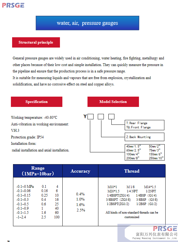 • Product description: General pressure gauges are widely used in air conditioning, water heating, fire fighting, metallurgy and other places because of their low cost and simple installation. They can quickly measure the p
