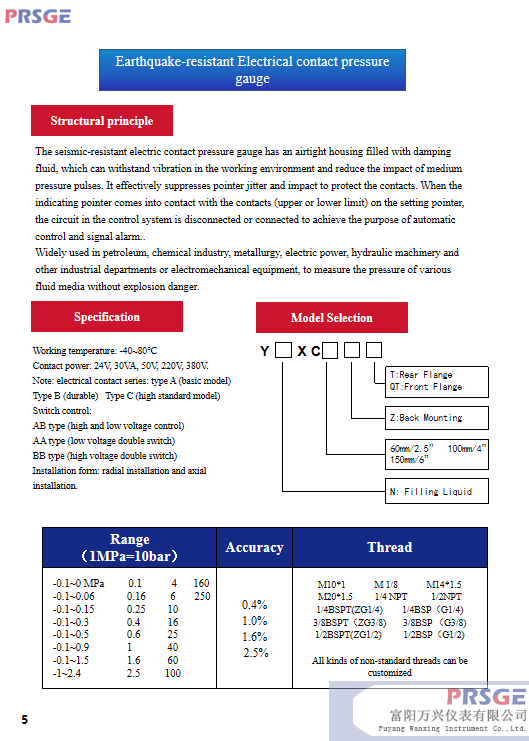 Product description: The seismic-resistant electric contact pressure gauge has an airtight housing filled with damping fluid, which can withstand vibration in the working environment and reduce the impact of medium pressu